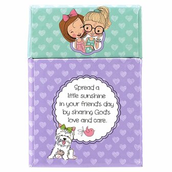Een box met 51 kaarten met aan beide zijden van de kaart en inspirerende Bijbelstekst, spreuk en/of een uitspraak. Verpakt in een stevige opbergdoos van glanzend karton. Een waardevol geschenk voor alle leeftijden om in zijn geheel of om een kaart als zegen in bijvoorbeeld een lunchbox, rugzak, (reis)tas, portemonee of (jas)zak mee te geven.