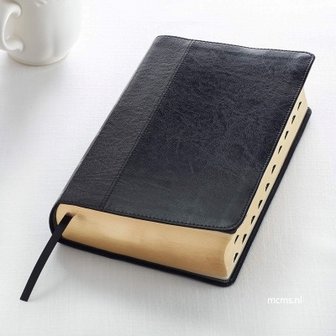 De tweekleurige zwarte hoes is gemaakt van hoogwaardig, handvervaardigd materiaal geïmporteerd uit Italië, met de look en feel van echt leer (handelsnaam LuxLeather). Ontwerpkenmerken van deze Giant Print Bible zijn onder meer een titel in bladgoud met vergulde pagina's met gouden randen en een aangehechte paginamarkering op het lint die de unieke schoonheid van deze Bijbel benadrukt. In de zwarte kunstleren Bijbel vind je het vergrote afdrukformaat in een dubbele kolom, voetnoot kruisverwijzingsgids, concordantie, een handige bijbelversvinder per onderwerp en een eenjarig Bijbelleesplan.