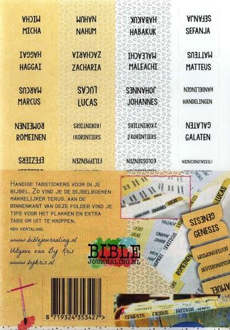 Handige tabstickers voor in de Bijbel. Vindt de Bijbelboeken makkelijker terug. Met aan de binnenkant van de folder (verpakking) tips voor het plakken en extra tabs om uit te knippen.