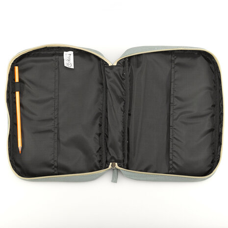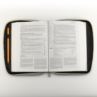 De zacht gewassen kadetblauwe "Grace" canvas Bijbelhoes heeft aan beide kanten handige extra vakken.