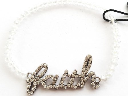 Het woord "Faith" is omgeven door witte kristallen kralen.